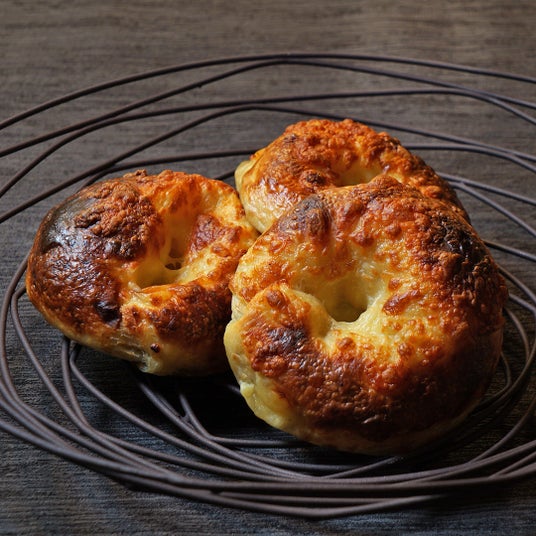 3種チーズ ¥380生地にゴルゴンゾーラチーズ、ダイスチーズを練りこみ上からさらにシュレッドチーズをかけて焼き上げました。チーズの風味豊かなベーグルで食感も少し軽めにしあげているので、サンドイッチにもおすすめです。
