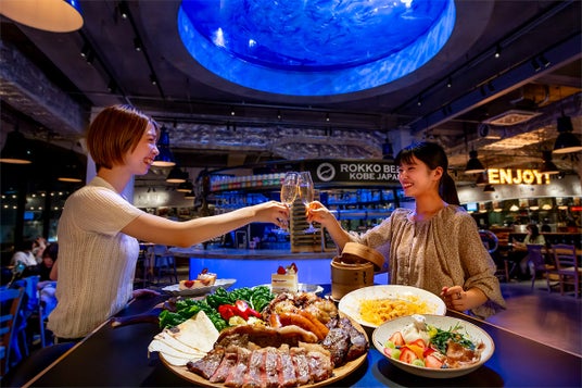 『TOOTH MART 海のビアガーデン2025』最大の魅力は、ご利用シーンに合わせて選べる2つのスタイル。開放的なテラス席では、神戸の海風を感じながらBBQスタイルのビアガーデンを楽しむことができ、約300席ある店内席では、劇場型アクアリウムatoaの巨大水槽を眺めながらゆったりとビアガーデンを楽しむことができます。さらに、全プランに付いてくるミールチケットを使って神戸グルメが味わえる9つのショップで自分好みの”食”を楽しめるのも魅力のひとつ。TOOTH MART FOOD HALLだからこそ体験出来る、その魅力を詳しくご紹介いたします!