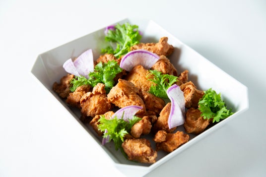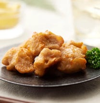 おにゃくから揚げ豆乳や豆腐を作る際の副産物「おから」と日本の伝統食である「こんにゃく」を組み合わせた『おからこんにゃく(R)』で作った動物性原材料不使用のから揚げです。おかずの一品としても満足いただけるよう、和風ベースで飽きの来ない、ジューシーな味わいに仕上げました。
