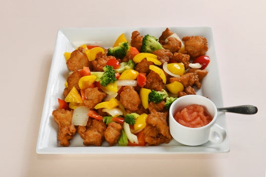 動物性原材料不使用のから揚げに彩り豊かなパプリカ、甘みの玉ねぎ、緑鮮やかなブロッコリーを塩とひまわり油で香ばしく仕上げたメニューに明太風ソースが添えてある食べ応え抜群の一品。 (当社「おにゃくから揚げ」使用)