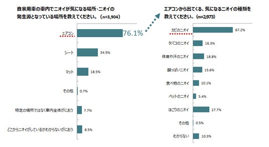 車内でニオイが気になる場所は「エアコン」、ニオイの種類は「カビ臭」