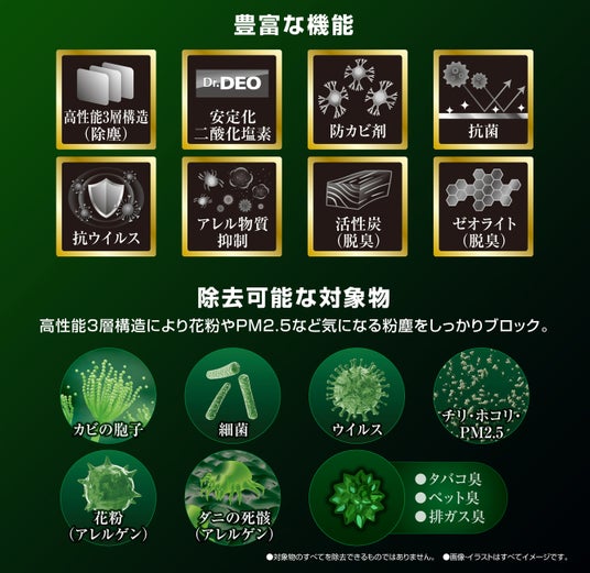 「除塵シート層」「活性炭層」「ドクターデオシート層」の3層構造。防カビだけでなく、チリやホコリを始め、PM2.5まで除塵し、活性炭やゼオライトで脱臭。ドクターデオプレミアムの成分による抗菌&抗ウイルス効果など多くの機能を備えています。
