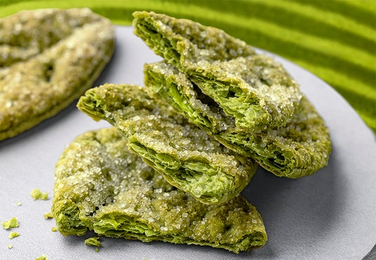 一番のこだわりは、抹茶の美味しさを最大限に引き出す324層重ねのパイ生地。幾層にも折り上げた生地をさっくり香ばしく焼きあげることで、抹茶本来のほろ苦い風味と、体験したことのないサックサク食感を楽しめる一品に仕上げました。さらにザクッと歯ざわりの抹茶シュガーを全体にまぶして、食感にアクセントをプラス。ひと口サクッと頬張れば、抹茶の芳醇な香りがお口いっぱい広がります。『お抹茶リーフパイ 茶の音』が奏でる食感の“音”をお楽しみくださいね!