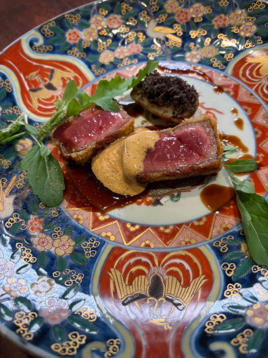 【作り方】ジビーフ(放牧牛)にパン粉をつけて油で揚げる、一度ローストしていたメークインも揚げる、揚がったらジビーフ、メークインを皿に盛りメークインの上にトリュフを削り、「フォーム甘口醤油」と赤ワインソースをかけルッコラを飾り完成。【材料】「フォーム甘口醤油」、ジビーフ、2年熟成メークイン、黒トリュフ、ルッコラ、赤ワインソース