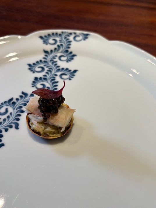【作り方】「リーフしょうゆ(またはみそ)」をタルト型に敷いてバーナーで炙り器を作る。その器にカニのほぐし身、カニ足、キャビアを盛りアマランサスを飾る。【材料】 「リーフしょうゆ(またはみそ)」、カニのほぐし身、カニ足、キャビア、アマランサス