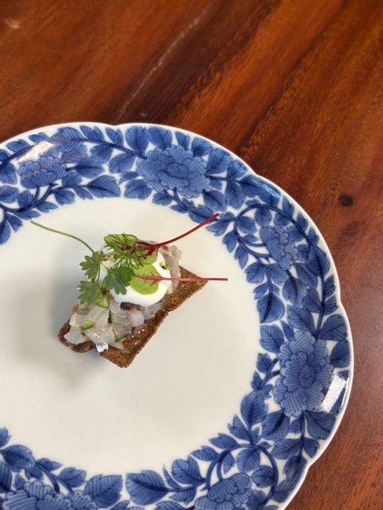 【作り方】材料を細かくカットし合わせる、そば粉のガレットの上にタルタルを盛りつけ、その上に「フォーム透明醤油」を絞りハーブを飾りました。【材料】「フォーム透明醤油」、白身魚(はた・さより)、ホタテ、自然薯、きゅうり、みょうが、ハーブ、そば粉ガレット
