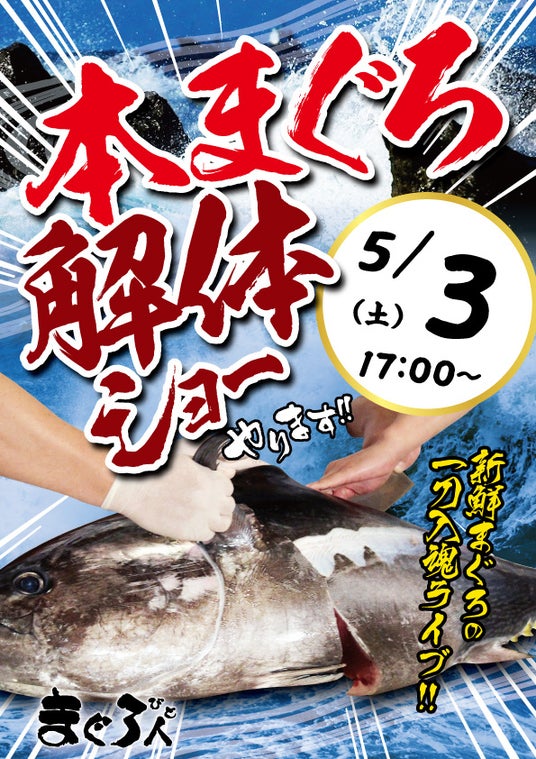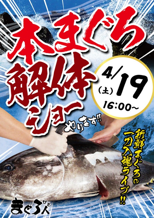 【大迫力!】4/19(土)16時より「まぐろ人 立川店」、5/3(土・祝)17時より「こだわり廻転寿司 まぐろ人 秋葉原店」にて『本まぐろ解体ショー』を開催!