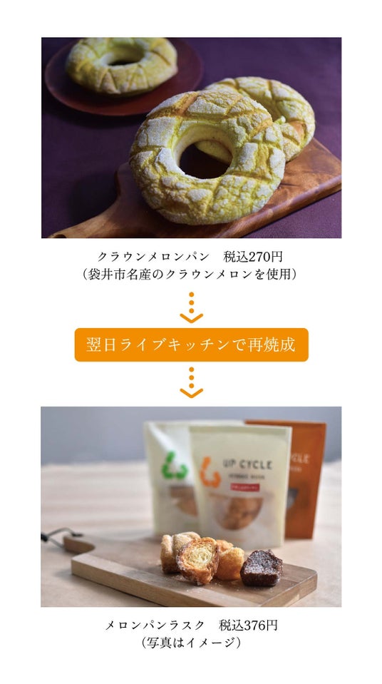 例)日々ライブキッチンで焼き立てで製造した商品を翌日再焼成してラスクとして販売します。