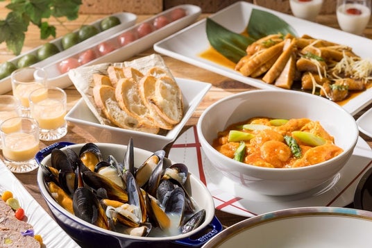・スモークサーモンのミルクレープ、ディルとケイパー風味・プロヴァンス風パテ、コンディマン色々添え・丸鶏仕込みの棒棒鶏・ブルターニュ風ムール貝のマリニエール・ケサディーヤ・中華風小海老のマヨネーズ和え・トマトのコールドスープ ほか