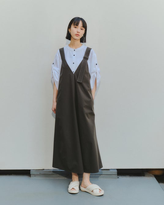 緩やかに広がるAラインシルエットで、身体離れがよく涼しい着心地と体型カバーを両立したデザインのワンピース。深めに開いたVネックにより、カットソーやブラウスなどさまざまなインナーとのレイヤードが楽しめます。
