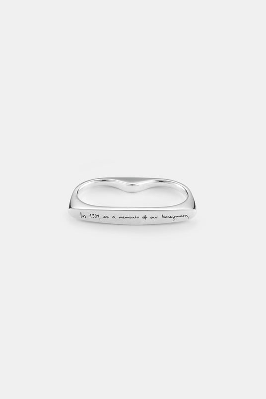 「RENEE TWO FINGER RING」はフラットなフロントに、「In 1981,as a memento of our honeymoon,」(1981年、新婚旅行の記念に)と刻印を配置。