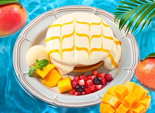 店舗で手作りの爽やかなレアチーズクリームと、厳選した2種類のマンゴーを使用「アップルマンゴー&レアチーズクリームのホットケーキ」『珈琲館』と『珈琲館 蔵』にて、4月24日(木)より新発売!