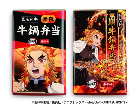 初コラボを記念して販売する『黒毛和牛 無限 牛鍋弁当』は、オリジナルホイルステッカーに加えて、掛け紙も特別バージョンで登場いたします。アニメ「鬼滅の刃」より炎柱・煉獄杏寿郎のイラストを大きくあしらった2パターンをご用意しております。もちろん肉の老舗として、おいしさにも徹底的にこだわっております。主役の黒毛和牛は、精肉店も展開する柿安が厳選し、「柿安ダイニング」の料理人が店内厨房で一枚一枚丁寧に炊き上げております。少し甘めの秘伝のタレは、黒毛和牛の奥深い旨みや甘みを引き立てるように独自配合。玉ねぎやごぼう、糸こんにゃくも、お肉の旨みを含んだタレで炊くことで、より一体感のある味わいへと仕上げております。さらに、長ネギや豆腐、「柿安」の焼印が入ったお麩を詰め合わせ、細部にまでこだわった贅沢な内容となっております。