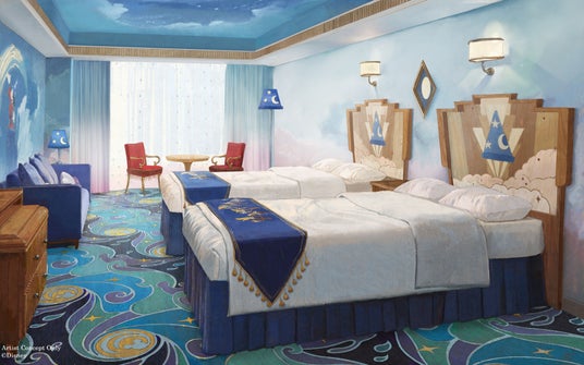 この客室は、ディズニー映画『ファンタジア』の「魔法使いの弟子」※の世界観を感じることができる客室です。壁には映画に登場するローブ姿のミッキーマウスが描かれており、ヘッドボードやランプシェードには月と星のモチーフがあしらわれた魔法使いの帽子がデザインされています。