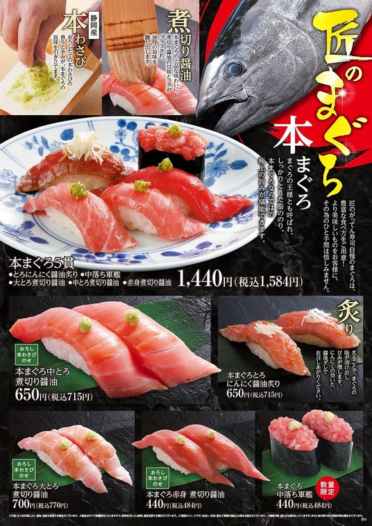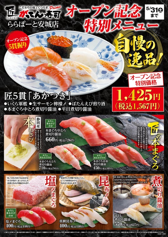 大型商業施設「ららぽーと安城」にオープン!!いくら軍艦、生サーモン檸檬〆、本まぐろ中とろ煮切り醤油など、素材を熟知した職人が握るオープン記念の匠5貫握り「あかつき」を期間限定販売!