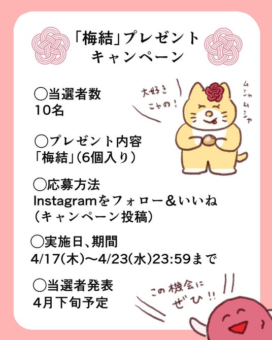 癒やされるイラストとメッセージでSNSを中心に人気を誇るなおにゃんさんのオリジナルキャラクター「うめむすめ」がInstagramを通じて、心温まる日常を紹介しながら、大阪土産「梅結」のブランド体験をより親しみやすくお届けします。
