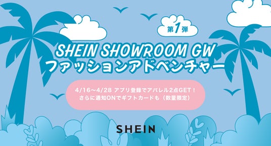 「SHEIN TOKYO」では、2025年4月16日(水)~5月6日(火)までの期間限定で「SHEIN TOKYO GW ファッションアドベンチャー」を開催いたします。本イベントでは、SHEINアプリをダウンロードのうえ会員登録いただいた方に、お好きなアパレルアイテム2着をプレゼントいたします。さらに、アプリ内のメッセージ通知設定をオンにすることで、SHEINで使えるギフトカードもプレゼントいたします。