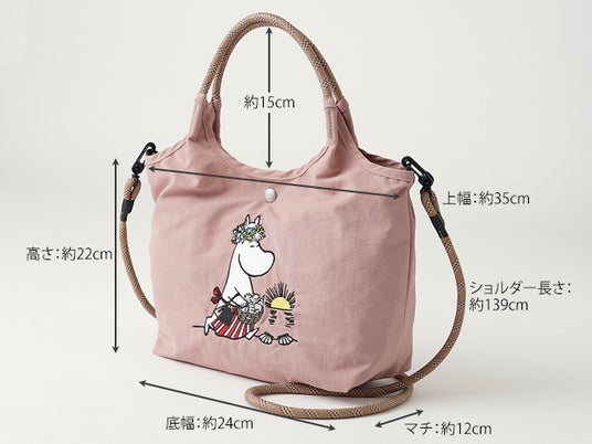 大人気キャラクターのムーミンママが刺繍された2WAYバッグ。必要最小限のアイテムをざっくり収納できる内ポケット1つの最小限のギミックでトップにはニョロニョロが刻印されたボタンが付いています。