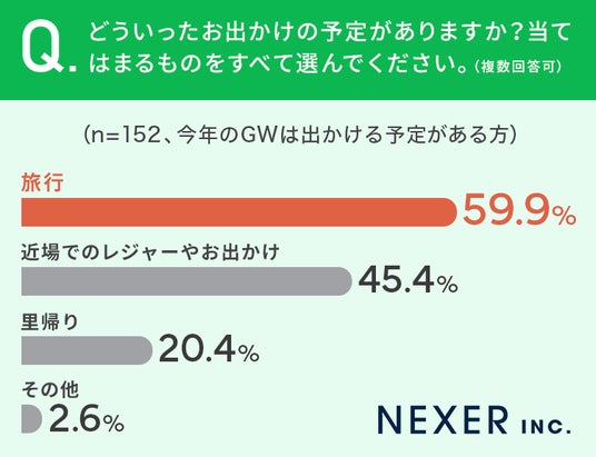 約6割の方が「旅行」、4割以上の方が「近場でのレジャーやお出かけ」と回答しています。