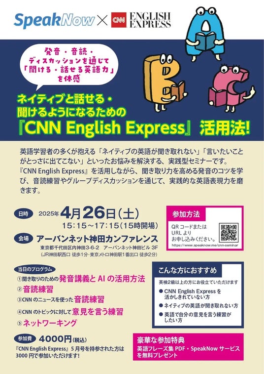 英語コーチングスクール「SpeakNow」(運営:株式会社NEXTs)は、株式会社朝日出版社が発行する人気英語学習誌『CNN English Express』とのコラボレーションによる特別英語セミナーを2025年4月26日(土)に開催いたします。
