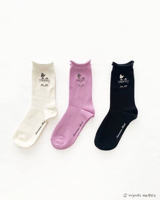 毎回人気のソックスは、足元からちらっと覗くネコの刺繍がワンポイント。パープルはコーデのアクセントにも◎