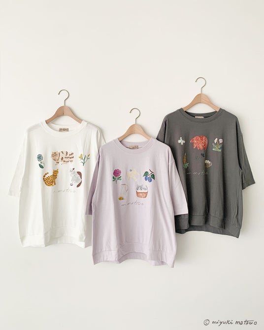 今回のコラボでは全5アイテムを展開。夏のマストアイテムのTシャツには、松尾さんの独特なタッチで描かれたネコやイヌ、花などのイラストをプリント。ナチュラルなカラー使いで大人可愛い印象に仕上げました。