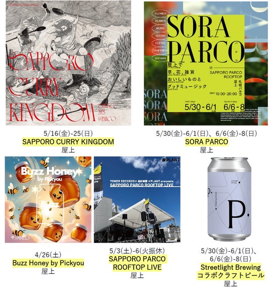」、スパイスカレーの祭典「SAPPORO CURRY KINGDOM」、パンや菓子・花・雑貨店が日替わりで20店舗以上集まるマーケットイベント「SORA PARCO」など、こどもから大人までたのしめるイベントを多数ご用意しています。さらに、周年を記念して製作した「札幌PARCOオリジナルクラフトビール」も登場します。