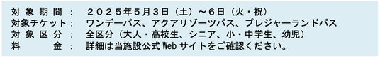 2025年5月3日(土)~6日(火・祝)の期間は、一部チケット料金を変更させていただきます。