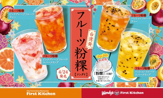 ウェンディーズ・ジャパン株式会社及び、ファーストキッチン株式会社 (所在地:東京都新宿区、代表取締役:紫関修) は、4月24日(木)から、ウェンディーズ・ ファーストキッチンとファーストキッチン(競馬場店を除く)で、トロピカルなパッションフルーツや、みずみずしいピンクグレープフルーツをたっぷりと使用した、フルーツ粉粿(フングイ)※4種を発売します。粉粿は台湾発祥の伝統的なスイーツで、ぷにぷにとした新食感が楽しめます。粉粿とフルーツをベースに、しゅわっとした爽快感が楽しめるセブンアップ(炭酸飲料)や、ダージリンの香りとすっきりとした味わいが特徴のフルーツティーをラインナップしています。ウェンディーズ・ファーストキッチンとファーストキッチンでは昨年にフルーツ粉粿を期間限定で販売したところ、大変好評であったことから、お客様の声にお応えする形で復活いたします。