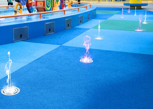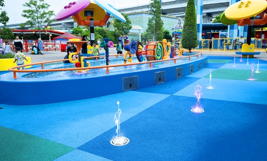 レゴ(R) ブロックで作られた楽器のモニュメントの前に立つと、様々なメロディーが流れる楽しい仕掛けの「ドレミでパチャチャ」。高さ約30~50cmの水柱が、ライトで色とりどりに照らされながらパチャパチャと吹き出し、視覚や聴覚でも楽しめるウォーターエリアです。広さ260平方メートル のスペースは、小さなお子さまも安心して遊べるように、床面はゴムチップ入りの柔らかい素材でできており、裸足で駆け回っても痛くありません。飛び出す水を避けたり浴びたりしながら、親子で一緒に光と音の楽しい水遊びを満喫しよう。