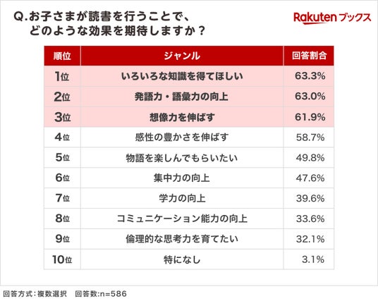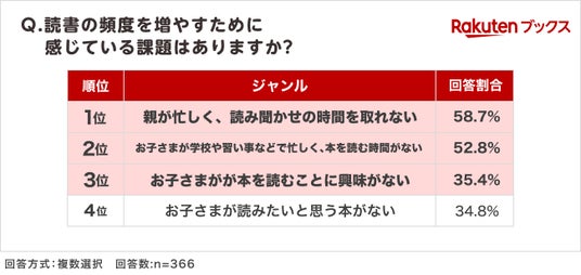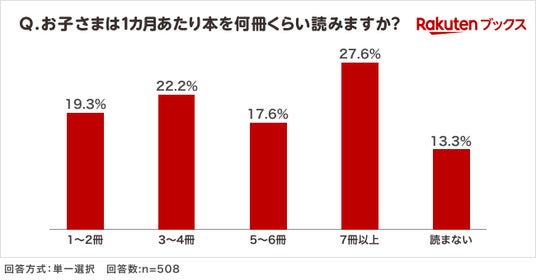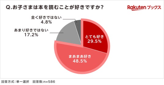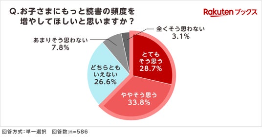 楽天グループ株式会社(以下「楽天」)が運営するオンライン書店「楽天ブックス」は、4月23日(水)から始まる「こどもの読書週間」(注)に先駆けて、楽天が提供する妊娠中や育児中のママ・パパを対象とした無料のメンバーシッププログラム「楽天ママ割」メンバー586名を対象に実施した「子どもの読書に関する調査」結果を発表しました。