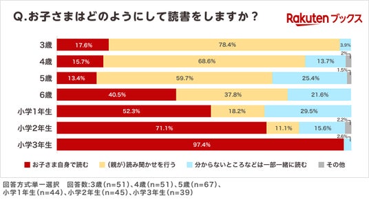 3歳~小学3年生の子どもがいるというユーザーに読書の方法を年齢別で聞いたところ、3歳では約8割が「(親が)読み聞かせを行う」と回答しました。一方で、6歳では「子ども自身で読む」と答えたユーザーの割合が約4割まで上昇し、小学1年生では半数以上が自身で読んでいることがわかりました。この結果から小学校入学を機に、主体的に読書に取り組むようになる傾向がうかがえます。