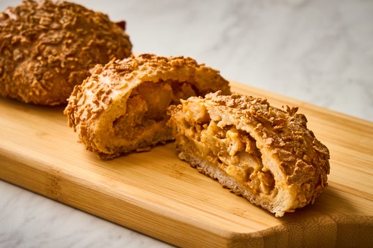 焼きカレーパン ¥350タイ発祥のココナッツミルクを使用した、独特な味わいが魅力の「マッサマンカレー」を包み、香ばしく焼き上げたカレーパンです。生地には食べ応えのある玄米フレークを使用し、カリカリとした食感が楽しめます。ココナッツミルクのまろやかな甘さとスパイスの調和が絶妙で、カレーの奥深い風味が口いっぱいに広がります。食事やおやつにもおすすめです。