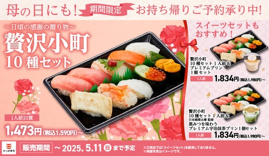 2025年の「母の日」は5月11日(日)。かっぱ寿司では、母の日をはじめ、感謝の気持ちを伝えたい相手と過ごす特別なひとときにぴったりな期間限定のお持ち帰り商品『贅沢小町10種セット』をご用意しました。『本鮪中とろ』や『みなみ鮪中とろ』、『うに』『いくら』に加え、『活〆ふわとろ煮穴子』や『赤えび』など、彩り豊かな豪華ネタが食卓を華やかに彩ります。