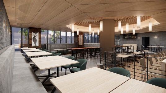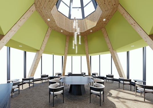 レストランは外からも目につきやすい1階に位置します。中央の八角形の柱を中心に客席が配置され、客席を一段下げることで中庭への視界が通り、明るく開放的な印象を与えるデザインとしています。