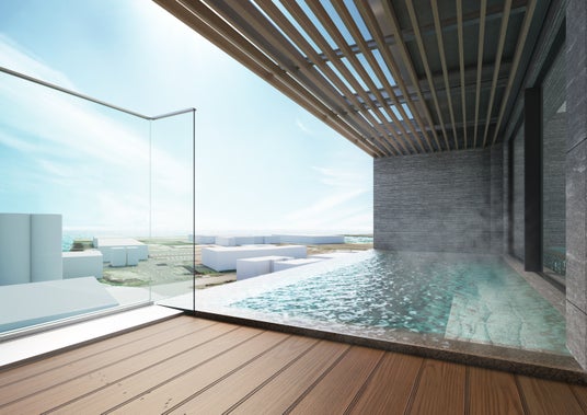 内部浴槽と露天風呂が繋がっているかのようなデザインの大浴場。石狩湾の海を一望できるオートロウリュサウナもお楽しみいただけます。石狩湾の海と浴槽が一体化となるデザインは、小樽でのひと時をさらにご堪能いただけます。
