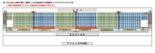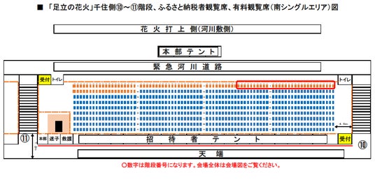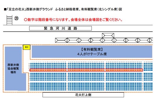 観覧席は、打ち上げポイント目の前で迫力の花火をお楽しみいただける千住側「南シングルエリア(シート敷)」と、打ち上げポイント対岸、ワイドに打ち上がる花火全体をゆったりとお楽しみいただける西新井側「北シングル席・ペアエリア(シート敷)・トリプルエリア(シート敷)・4人がけテーブル席」をご用意しました。