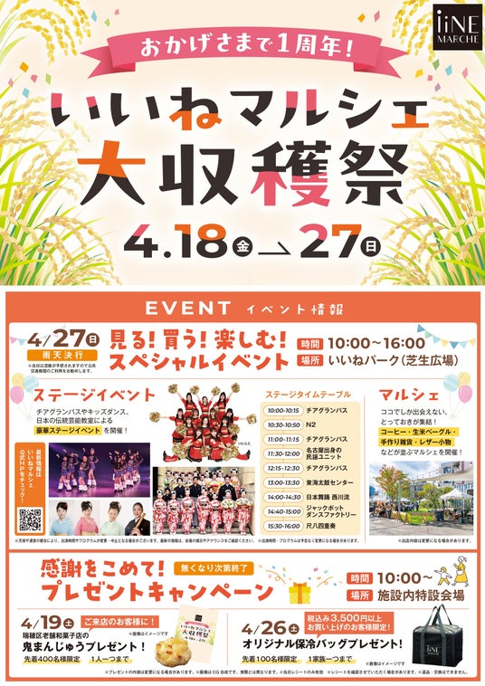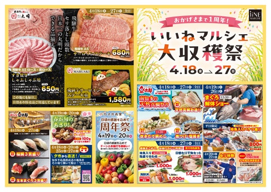 いいねマルシェ開業1周年を記念し、4月18日(金)~4月27日(日)の間「いいねマルシェ大収穫祭」を開催。全館でセールや各種イベントを実施し、感謝の気持ちを込めてお届けします。