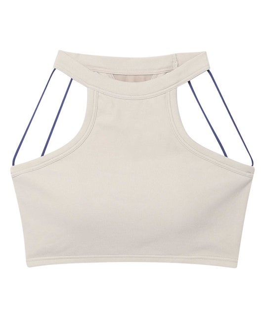 カッティングにこだわった、ヘルシーな印象のクロップド丈のアメリカンスリーブタイプのブラトップ。伸びのよいスムース生地を使用し、コンパクトなシルエットに仕上げました。バイカラーが印象的なベージュと、クールに着映えるブラックの2カラーで展開。アームホールのデザインストラップが、デザインのアクセントになっています。