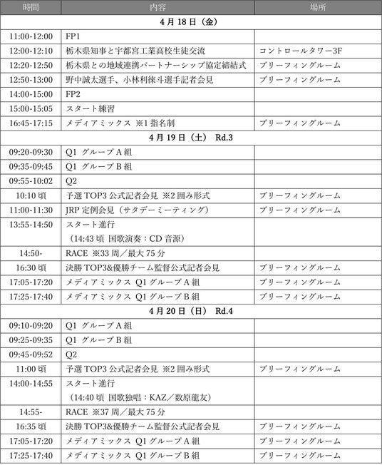 次掲載いたします。また、各セッションのドライバーごとのラップタイム、最高速度などの詳細データが必要な場合は、メディアセンターにてJRPスタッフへお声がけください。
