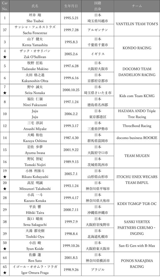 2025 SUPER FORMULA Rd.3-4 エントリーリスト