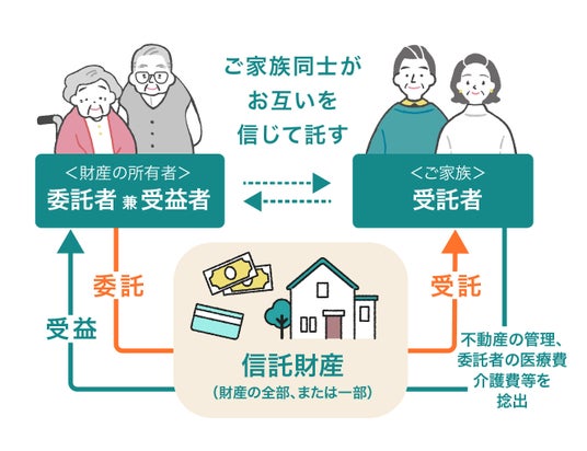 家族信託は、判断能力があるうちに現預金や不動産などの大切な財産を信頼できるご家族に託すことにより、たとえ認知症などにより判断能力が低下した後でも、ご本人の希望やご家族のニーズに沿った、柔軟な財産の管理や運用を実現することを目的とした仕組みです。