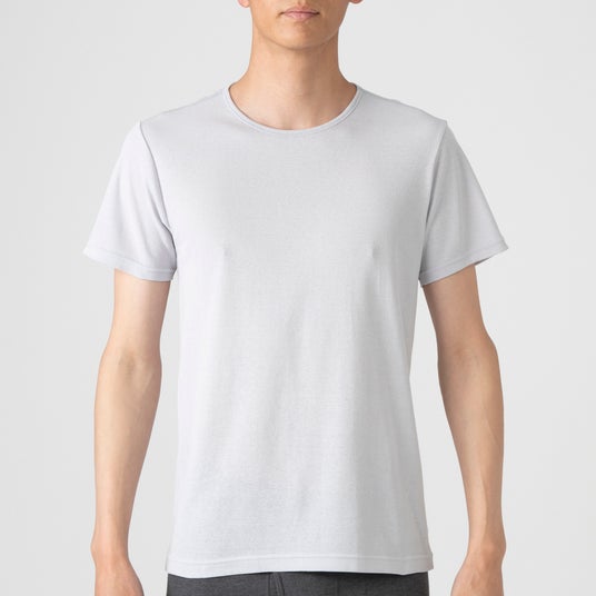 熱伝導率の高い鉱物を練り込んだポリエステル糸と毛羽の少ないレーヨン糸を使用しています。特殊な編み方をすることで、汗による衣類と肌との不快なべたつきを軽減し、さらっと、ひんやりした着心地です。メンズは効果長持ち強力抗菌機能付きです。