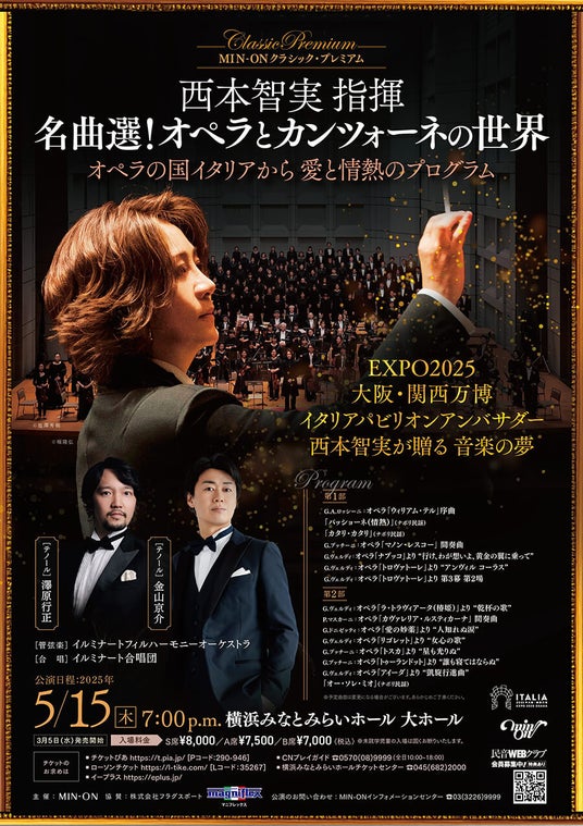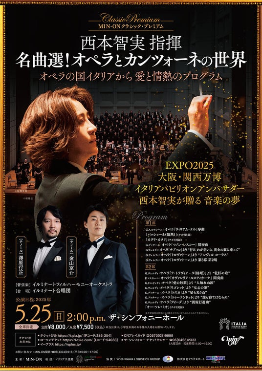 西本さんは、各国を代表するオーケストラ・国立歌劇場・国際音楽祭から招聘されている、日本が誇る最高の指揮者のひとりです。EXPO2025年大阪・関西万博では ローマ教皇庁、イタリア、2か国のアンバサダーを務められています。今回の特別コンサートでは、オペラの本場・イタリアの名曲の数々を、西本さん指揮のもと、西本さんが芸術監督を務めるイルミナートフィルハーモニーオーケストラ、イルミナート合唱団の演奏でお届けいたします。 広く親しまれているオペラとカンツォーネの世界をどうぞお楽しみください。深い感動に包まれる特別な時間となることでしょう。