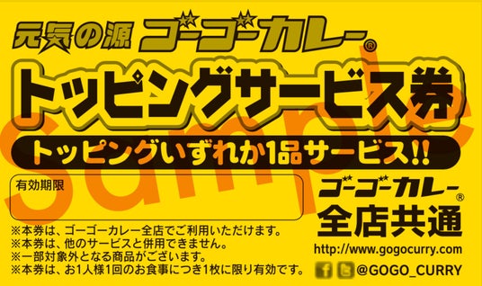 ※ゴーゴーカレーのお店で、対象トッピングの中からお好きなものを1つサービスいたします。