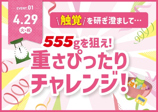 当日の1店舗での購入金額2,000円以上(税込み)のレシート提示で参加可能。お菓子を使って、制限時間内に見事重さを555グラムに合わせると、ピタリ賞で「五反田東急スクエア お食事・お買物券」、ニアピン賞(540~570グラム)で5周年ロゴ入りオリジナルお菓子をプレゼントします