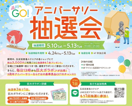 株式会社東急モールズデベロップメント(本社所在地:東京都渋谷区、代表取締役社長:小山晃司、以下:当社)が運営する東急池上線・JR山手線五反田駅直結の商業施設「五反田東急スクエア」(所在地:東京都品川区、以下:当施設)は、4月24日に開業5周年を迎えることを記念し、「5th Anniversary Ready GO!(フィフスアニバーサリーレディーゴー)」を開催します。