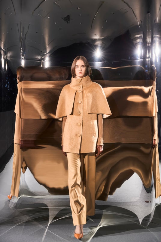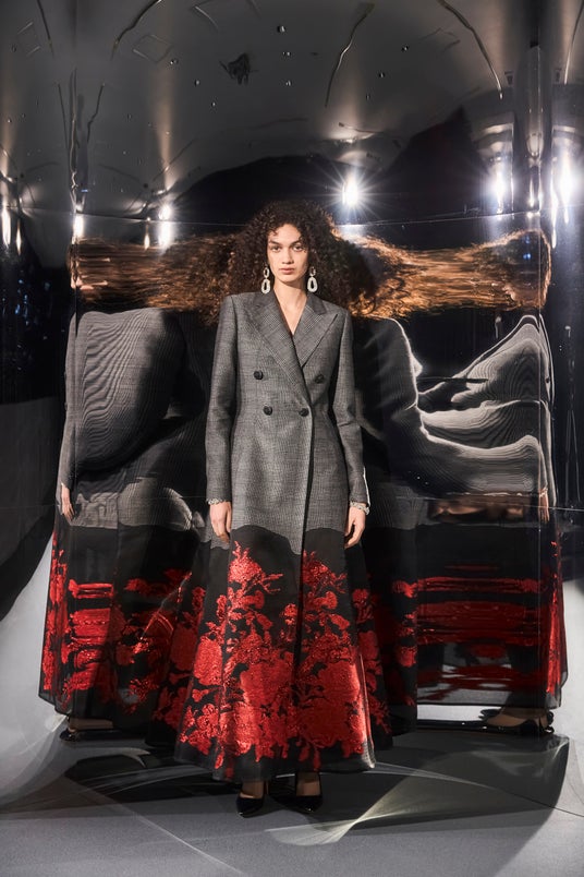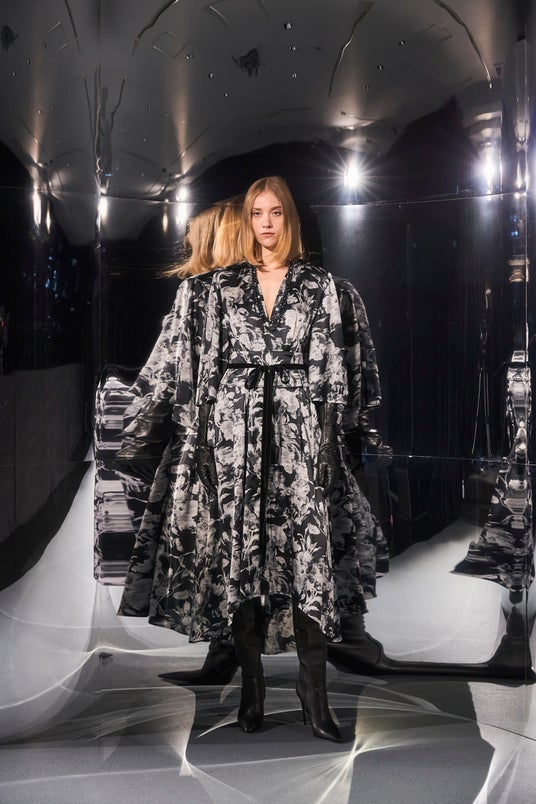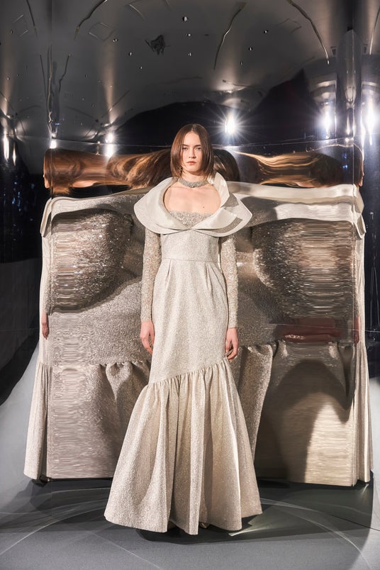 新作を纏ったモデルと波を打つように連なるミラーの「反射」が幻想的な空間を演出します。
