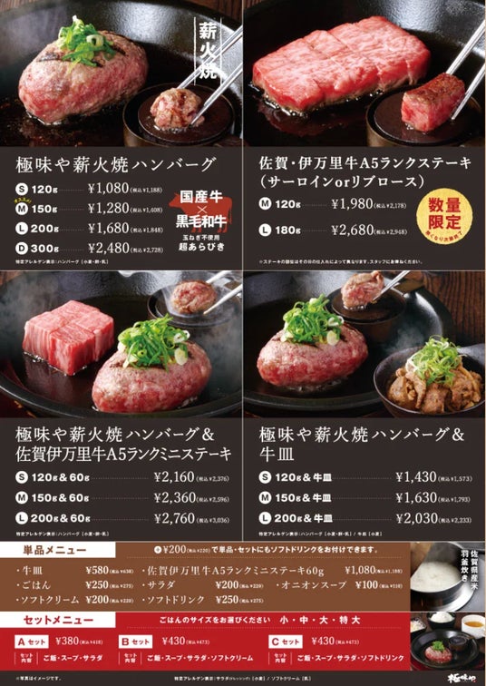 極味や薪火焼ハンバーグ&佐賀伊万里牛A5ランクミニステーキ/2,160円(税込2,376円)~