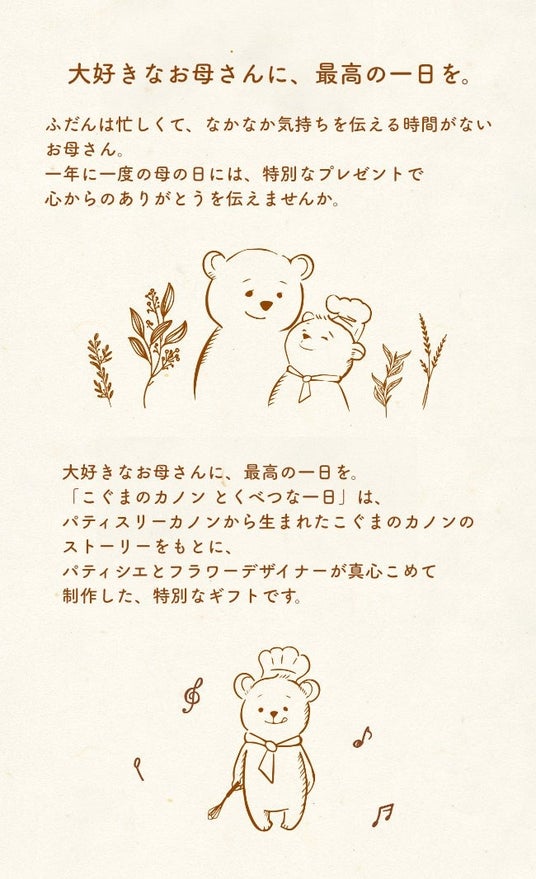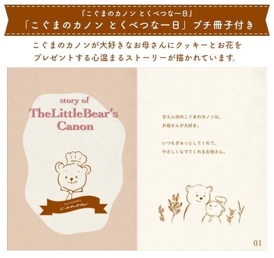 クマの親子の絆を描いたオリジナルミニ冊子「こぐまのカノン とくべつな一日」付き。ギフトに込められた想いをストーリーとして伝えることで、プレゼントの意味がより深く心に届きます。